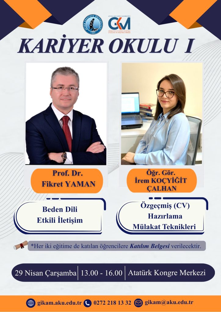Üniversitemiz bünyesinde öğrenim görmekte olan öğrencilerin kişisel gelişimlerini desteklemek ve mezuniyet sonrası profesyonel iş hayatına geçiş süreçlerini kolaylaştırmak amacıyla Girişimcilik ve Kariyer Geliştirme Uygulama ve Araştırma Merkezi merkez müdürü Prof. Dr. Fikret YAMAN ve merkez müdür yardımcısı Öğr. Gör. İrem KOÇYİĞİT ÇALHAN tarafından 29 Nisan 2026 Çarşamba günü Atatürk Kongre Merkezi’nde bir eğitim programı düzenlenecektir.